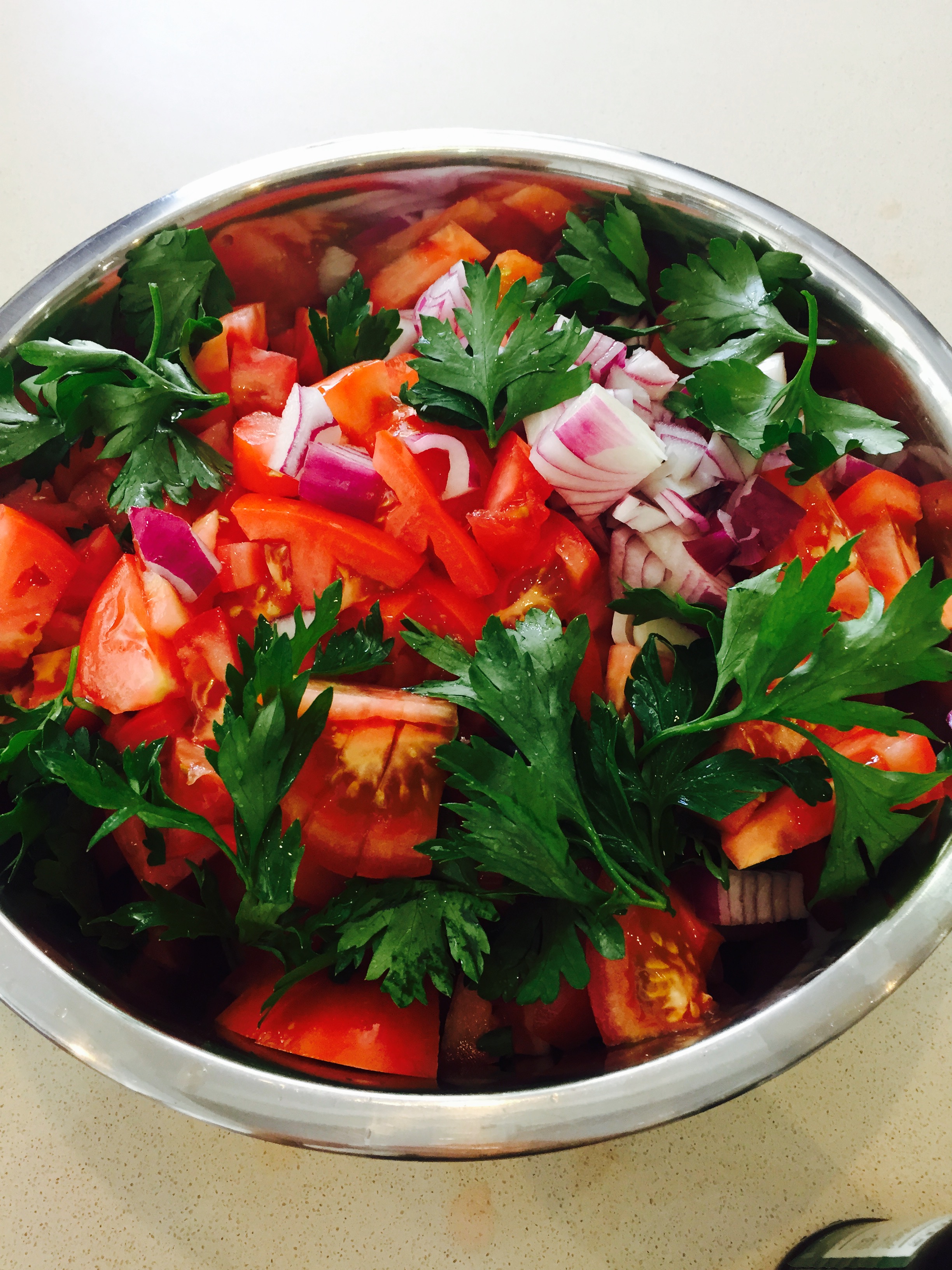note: recipe calls for red and yellow cherry tomatoes, mangoes but we prefer cucumbers and red onion. What ever works for you!